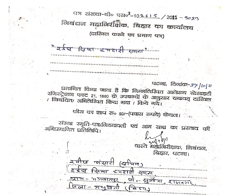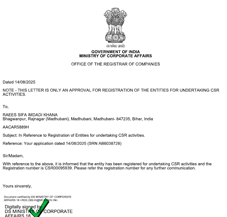 CERTIFICATE 12A certificateRAEES SIFA IMADADI KHANA 80G certificateRAEES SIFA IMADADI KHANA CSR-1 certificateRAEES SIFA IMADADI KHANA NGO DARPANRAEES SIFA IMADADI KHANA RAEES SIFA BY LAWSRAEES SIFA IMADADI KHANA RAEES SIFA REGISTRATIONRAEES SIFA IMADADI KHANA ANNUAL REPORT ANNUAL REPORT 2025 ANNUAL REPORT 2024 ANNUAL REPORT 2023 AUDIT REPORT AUDIT REPORT 2025 AUDIT REPORT 2024 AUDIT REPORT 2023 PAN CARD Send Email support@raeessifaimdadikhana.com Call Emergency 📞+917366805826 Address AT-BHAGWANPUR PO-SUGAUNA PS- RAJNAGAR DIST-MADHUBANI, BIHAR-847235 Who We Are About Us Team Certificate Gallery Contact Recognitions & Certificates 80G Recognition PMKVY Certificate What We Do Donate for PoorDonate for FoodDonate for EducationDonate for CowsDonate for GaushalaDonate for NatureDonate for Good CauseDonate for Social WorkDonate for School SuppliesDonate for Tree PlantationDonate for Health & Medicine Empower Us Donate online Become a volunteer Helpful Details Privacy Policy Terms & Condition NGO Disclaimer 📍 View on Google Mapsg Text Here Facebook Twitter Youtube
